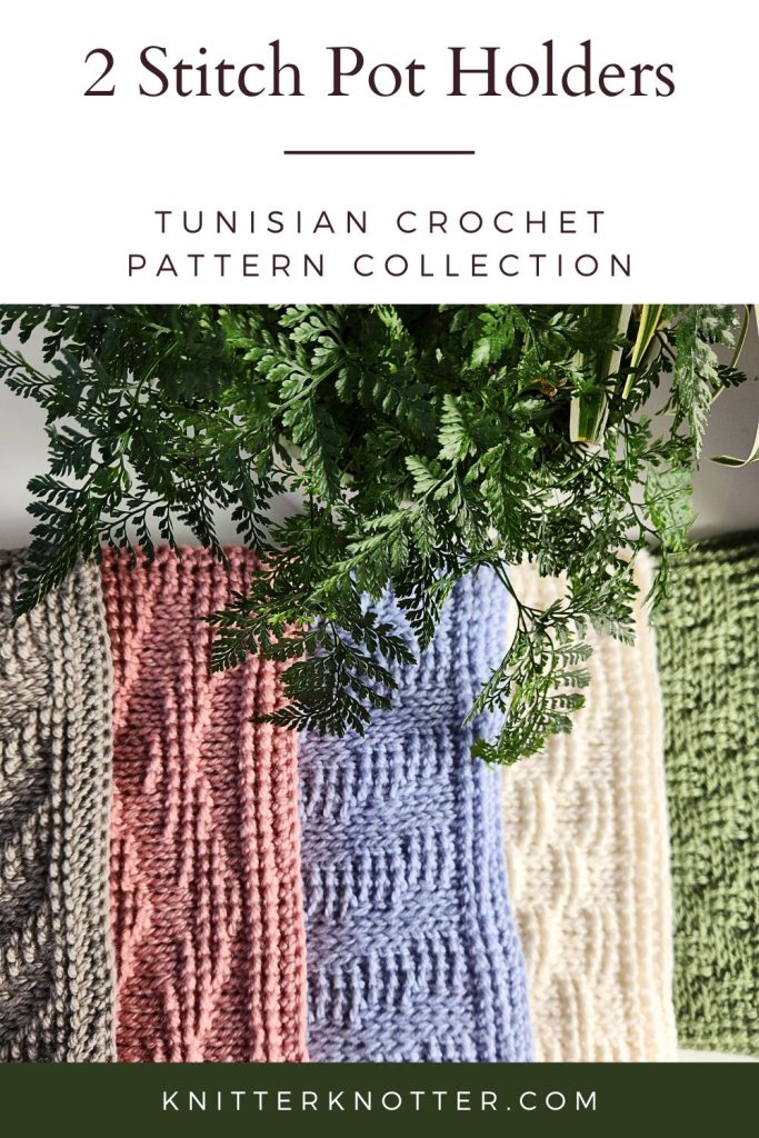 This Tunisian Crochet pot holder collection contains 5 different patterns that are easy to make and are full of texture!