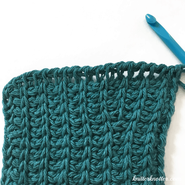 Step 2: Make a Rib Stitch as you would have without the decrease and continue all the way to the end of the row. The last stitch is made differently. Find the two vertical bars of the last stitch: the ones in the front and the back. Insert hook into both those bars, yarn over and pull through both of the vertical bars on the hook. You can see a detailed explanation of this step in the Tunisian Simple Stitch tutorial.